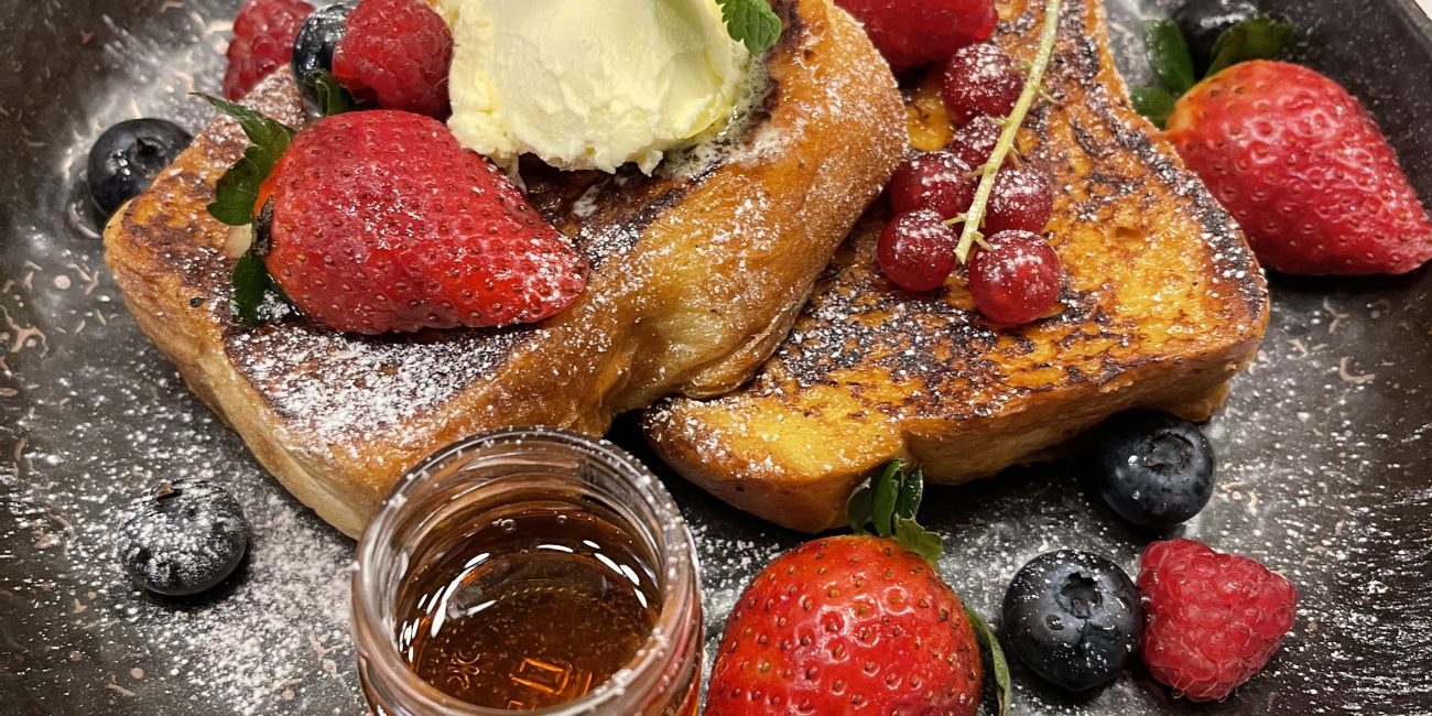 t w o b r i o c h e c u t s i n e g g b a t t e r • c l o t t e d c r e a m • f r e s h b e r r i e s • m a p l e s y r u p o r n u t e l l a