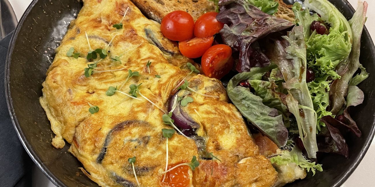 free range eggs / chestnut mushrooms/ halloumi / baked beans / hash brown / hollandaise / avocado slices / olives
