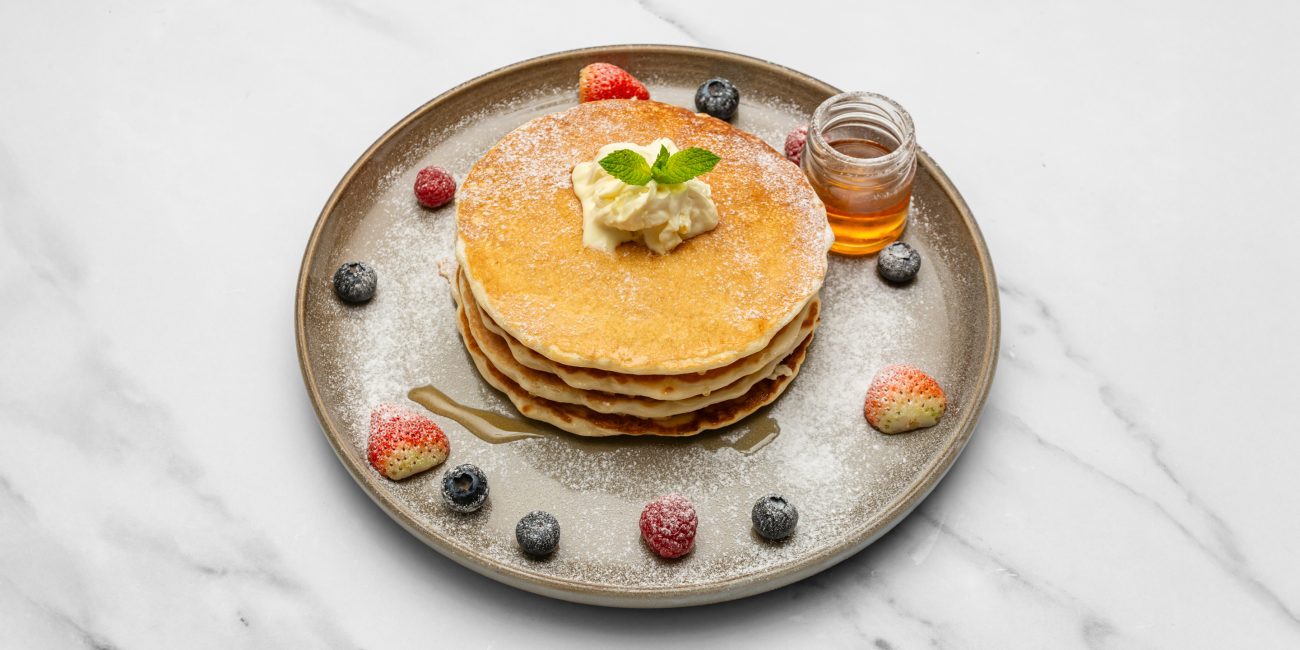 butter milk pancakes stack • clotted cream • assorted fruits • maple syrup ornutella