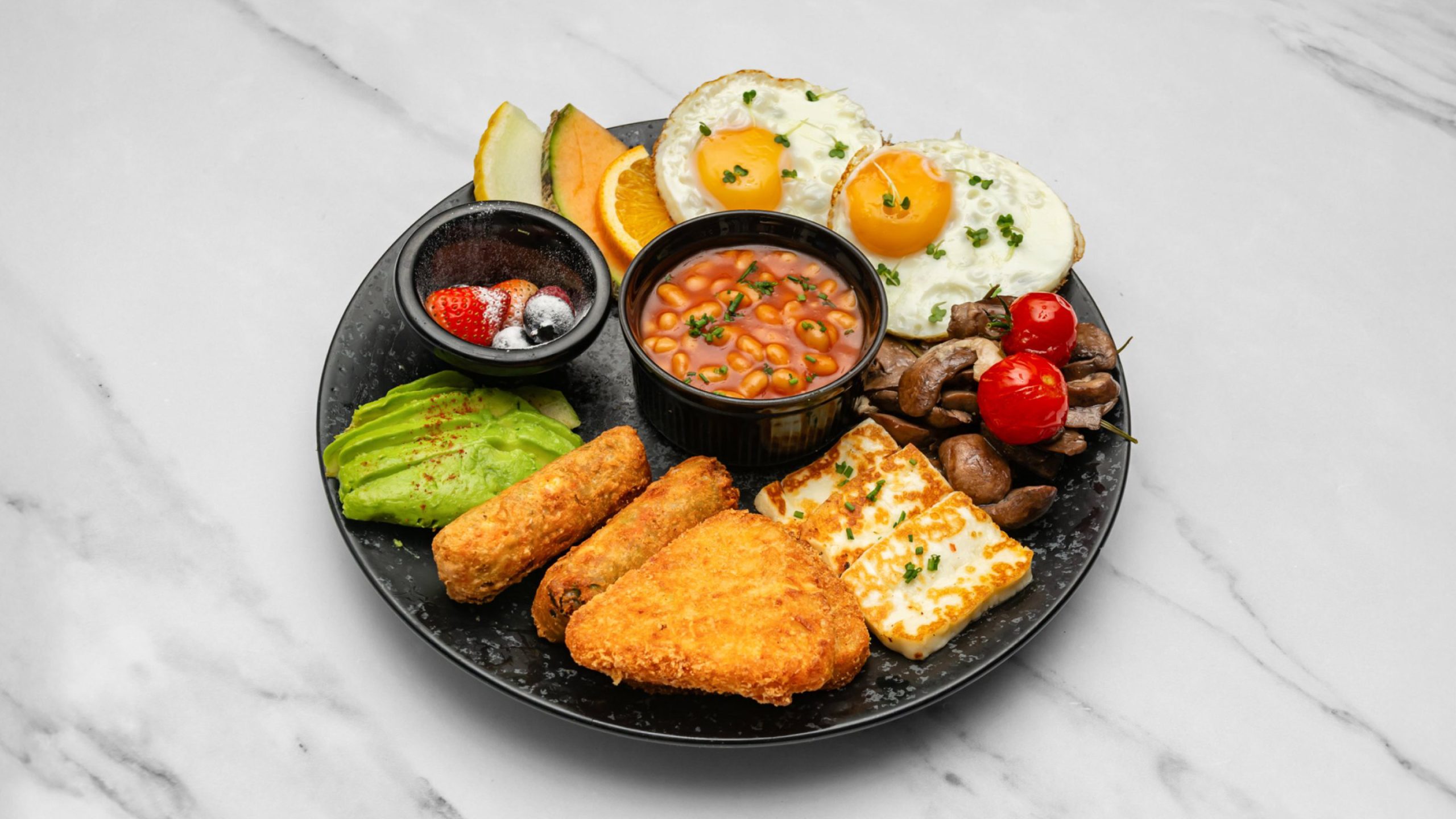 two fried eggs, two vegetarian, sausages, sourdough bread, halloumi, sliced avocado, grilled cherry, tomatoes, chestnut, mushrooms, baked beans, two hash, browns.